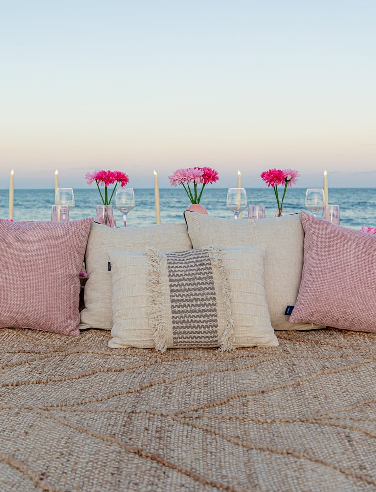 Montaje temático con Tapetes, cojines, mesa baja, mantelería, Tipi y sombrilla.
