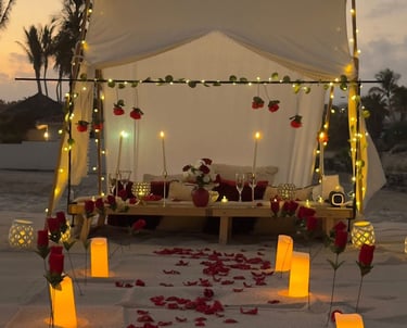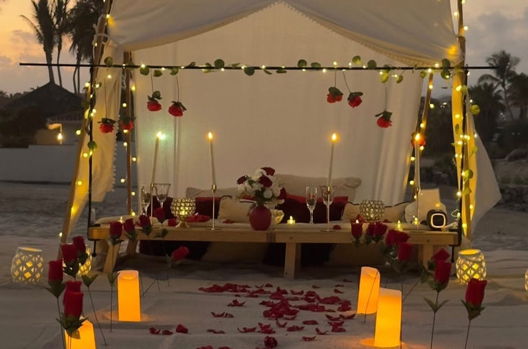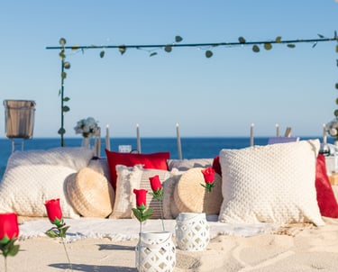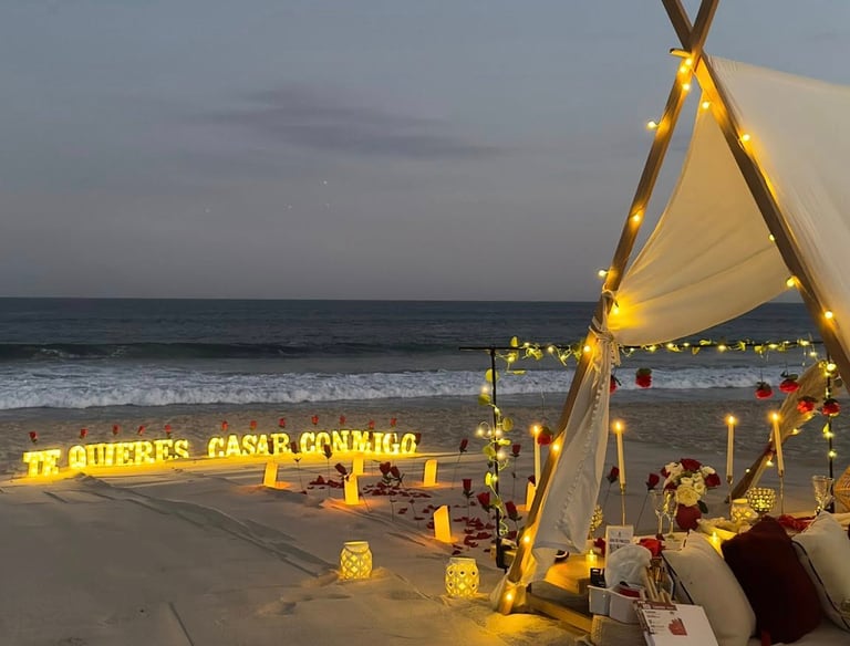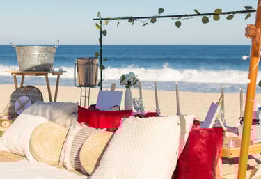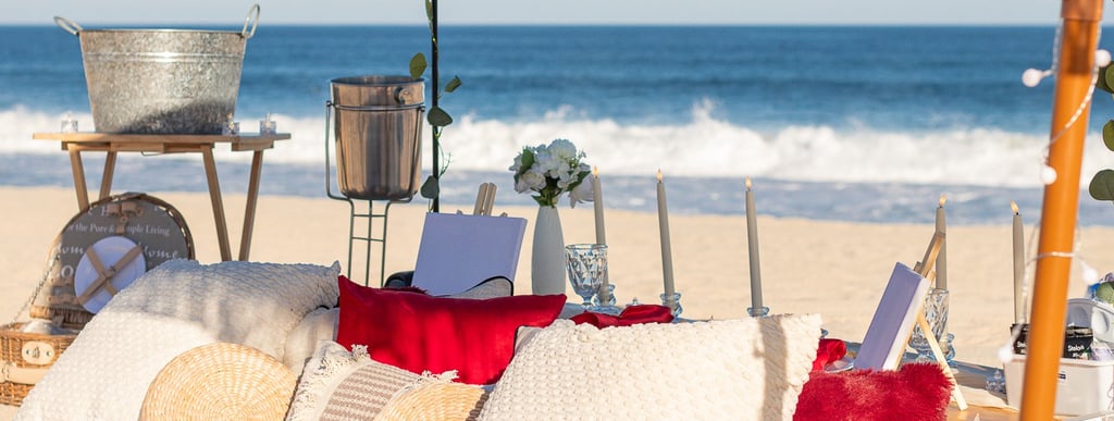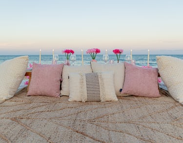 Un montaje íntimo y elegante en la playa, perfecto para disfrutar de una cita romántica junto a las olas.
