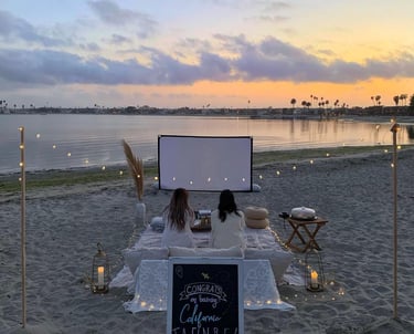 Vivan una noche de película en la playa con pantalla privada, snacks y el cielo estrellado como escenario.
