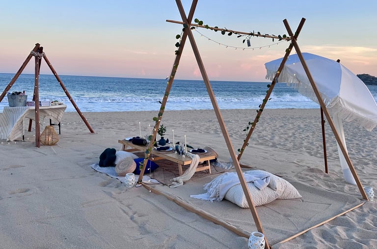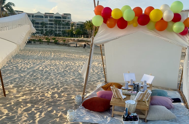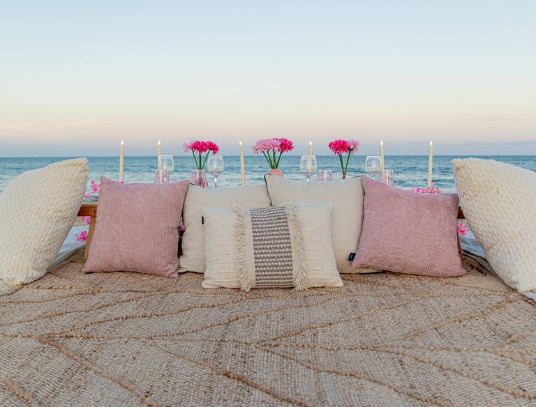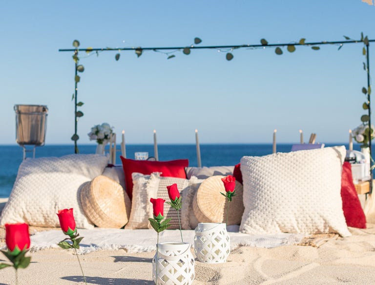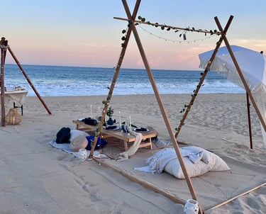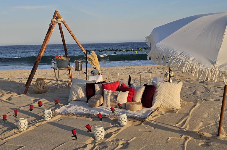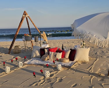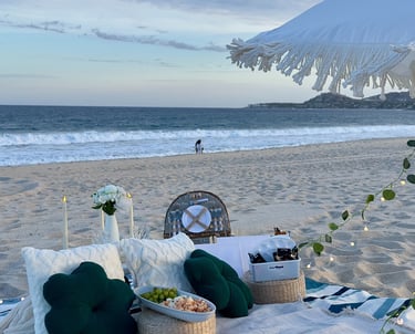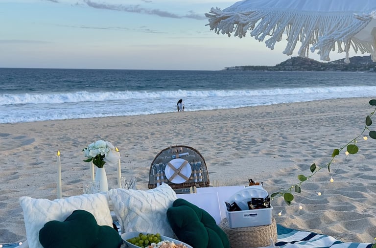 Descubre la magia de Los Cabos en un picnic romántico con decoración soñada, sabores gourmet y la brisa del océano