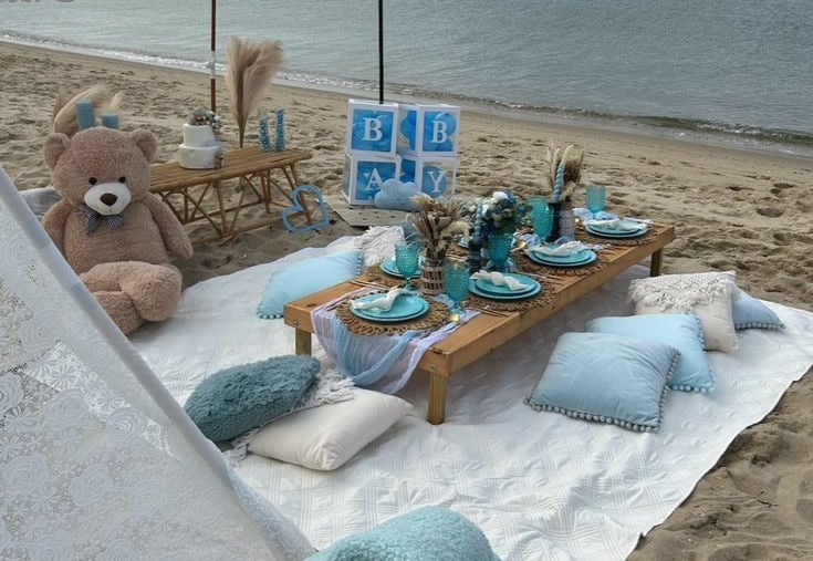 Celebra uno de los momentos más esperados con un picnic diseñado para la gran revelación: humo de colores y globos sorpresa, todo frente al mar.